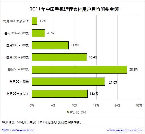 根據(jù)艾瑞咨詢近期發(fā)布的《2011年中國(guó)新興線下支付行業(yè)研究報(bào)告》的研究數(shù)據(jù)顯示,中國(guó)手機(jī)支付發(fā)生的場(chǎng)景主要集中在超市、便利店和商場(chǎng)等場(chǎng)所;并且,目前的中國(guó)用戶的手機(jī)支付金額,都以100元及以下的小額支付為主。