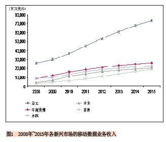 就絕對值來看亞太地區(qū)的新興市場將占主導(dǎo)地位,該地區(qū)的移動數(shù)據(jù)業(yè)務(wù)收入將從2010年的368億美元增長到2015年的734億美元,增長率幾乎為100%。給出這么高的預(yù)測值不足為奇,因?yàn)樵撌袌錾嫌兄袊、印度、印尼“三大巨頭”,這三個國家對該區(qū)域數(shù)據(jù)業(yè)務(wù)收入的貢獻(xiàn)將達(dá)到81%。