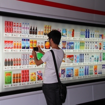 這種虛擬商店消費模式如今正漂洋過海而來,北京移動此前就曾推出過麥當勞電子兌換單服務,用戶可以通過短信接收二維碼,再去麥當勞門店掃描兌現(xiàn)。而細心的申城用戶如今也能在軌交過道中發(fā)現(xiàn)這樣的虛擬百貨商店廣告,這些燈箱廣告中出現(xiàn)了超市中才能見到的商品貨架,五顏六色的商品圖案讓人仿佛置身于大型超市一樣,但只有當你走近才會發(fā)現(xiàn)“貨架”竟然是“貼”在墻上的,從零食到衣服,甚至還有尿片,這里每一種產品下方都有相應價格和二維碼。