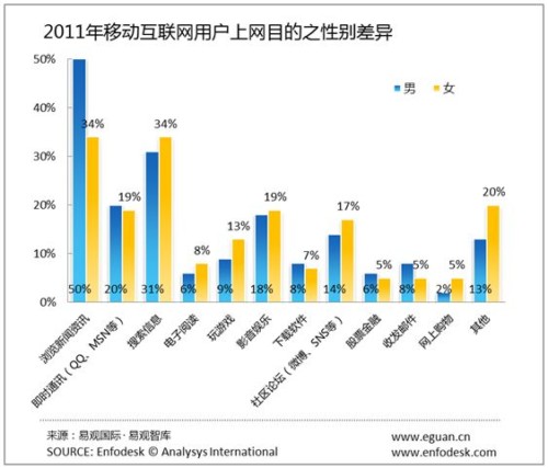 從用戶性別角度來(lái)看,男性用戶在瀏覽新聞資訊、股票金融、收發(fā)郵件上的使用上明顯高于女性用戶,與此同時(shí)及時(shí)通訊、社區(qū)論壇、影音娛樂(lè)和玩游戲上女性用戶的青睞度更高。