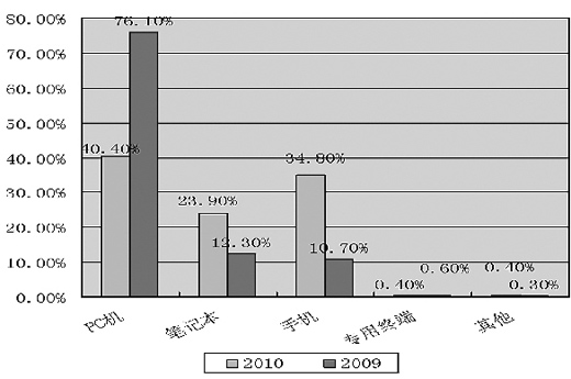 以手機(jī)為閱讀載體的比例從2009年的10.7%激增到2010年的34.8%。相比之下,PC機(jī)閱讀則出現(xiàn)了大幅度地滑落,從2009年的76.1%下降到2010年的40.4%?梢姡蟛糠滞ㄟ^PC機(jī)閱讀的讀者更加傾向或習(xí)慣于手機(jī)閱讀。