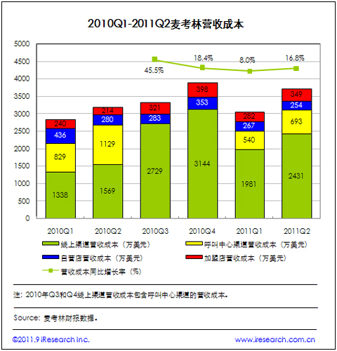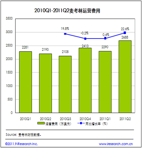 2011Q2麥考林運(yùn)營(yíng)費(fèi)用為2688萬美元,同比增加22.6%。據(jù)麥考林CFO披露,2011Q2市場(chǎng)營(yíng)銷費(fèi)用收入的比例為14%,即822萬美元(2011Q1市場(chǎng)營(yíng)銷費(fèi)用收入比例為13%,即625萬美元,且60%用于線上渠道,40%用于呼叫中心渠道),行政與管理費(fèi)用達(dá)到1774萬美元的水平。