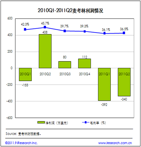 2011Q2麥考林整體毛利率為36.5%,2010年同期為45.7%;2011Q2凈虧損340萬美元,2010年同期凈利潤(rùn)為410萬美元。