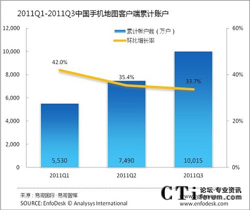 2011年第3季度中國手機(jī)地圖客戶端累計帳戶過億