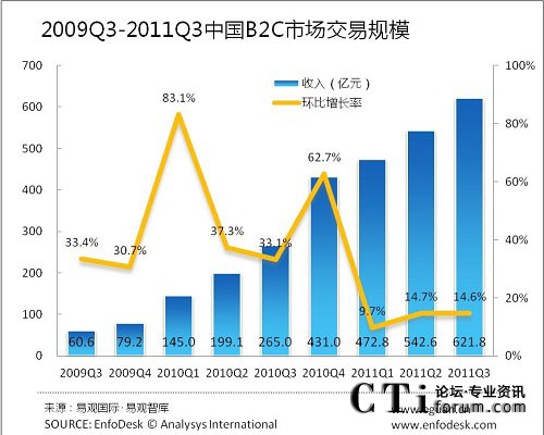 易觀智庫:2011年第3季度中國(guó)B2C整體市場(chǎng)增長(zhǎng)乏力