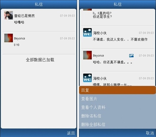武俠小說中每每寫到傳音時(shí),都愛這樣寫“不世高人傳音入密……”。這不世高人的稱號(hào)可是讓人夢(mèng)寐以求啊。語音微博1.6 for Symbian最新加入的私信功能助你一償夙愿。每每查看其他用戶以及他的語音微博時(shí),你都可以看到私信按鈕,點(diǎn)擊即可發(fā)送私信。傳音入密就是這樣簡(jiǎn)單。當(dāng)然,除了語音,你也可以傳送文字,很貼心有木有。