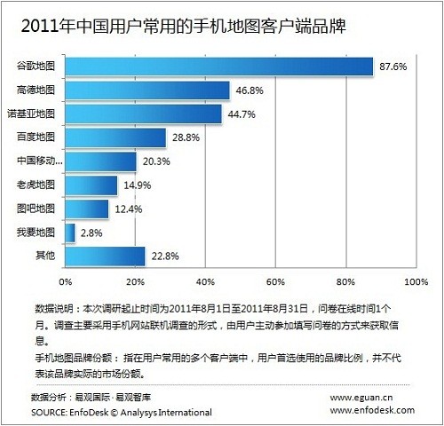 EnfoDesk易觀智庫(kù)研究發(fā)現(xiàn):進(jìn)入2011年下半年以來(lái),手機(jī)地圖市場(chǎng)發(fā)展有以下幾方面趨勢(shì):