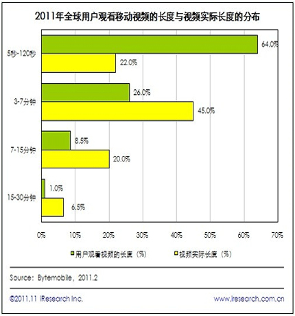 艾瑞咨詢?cè)谘芯緽ytemobile 2011年2月份發(fā)布的全球移動(dòng)視頻研究的報(bào)告中發(fā)現(xiàn),全球有64%的移動(dòng)視頻只被觀看了不超過2分鐘的時(shí)間,而時(shí)長(zhǎng)在2分鐘以內(nèi)的移動(dòng)視頻只有22%,也就是說,相當(dāng)多的視頻沒有被完整地看完。