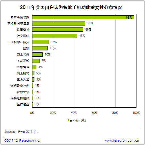艾瑞咨詢根據(jù)Pwc近日發(fā)布的美國移動互聯(lián)網(wǎng)用戶演變研究報告發(fā)現(xiàn),用戶對移動設(shè)備的使用和依賴程度增強(qiáng),同時,通過對用戶使用智能手機(jī)功能的調(diào)查發(fā)現(xiàn),用戶認(rèn)為最重要的功能主要集中在基本通信、獲取資訊信息、位置查找和社交網(wǎng)絡(luò)上。