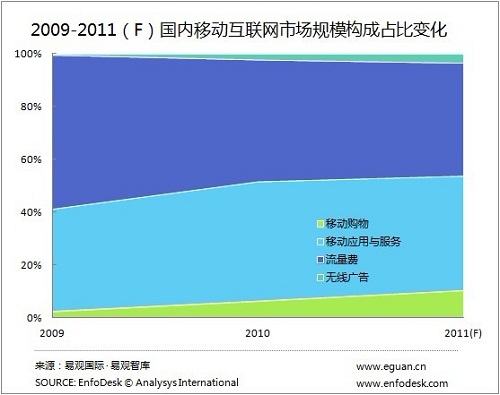 對比2009年到2011年市場規(guī)模的構成變化可以了解到,2011年移動購物與無線廣告在規(guī)模占比上都有了很大的提高,尤其是移動購物,從2009年的規(guī)模占比3%增長到11%,用戶對通過移動終端購物的習慣整逐步被得到培養(yǎng),另外值得注意的是2011年移動互聯(lián)網(wǎng)流量費占比低于50%,已經(jīng)從2009的58%減少至42%。