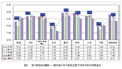 客戶服務(wù)MOT地圖(圖1)——該模塊通過對10086熱線服務(wù)過程的全景式展示,直觀表現(xiàn)不同地區(qū)、不同品牌客戶在10086熱線服務(wù)不同環(huán)節(jié)上的核心需求,話務(wù)員通過本模塊,可以迅速把握10086熱線服務(wù)的要點;
