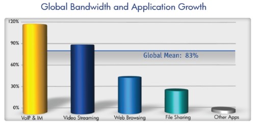 雖然網(wǎng)絡(luò)電話與即時(shí)通訊在下半年的網(wǎng)絡(luò)帶寬中占比仍然很低,它們的申請(qǐng)量證明了其在高速發(fā)展,相比上半年提升了114%。在下半年,Skype占了全球手機(jī)網(wǎng)絡(luò)電話使用量的79%。然而由于新競(jìng)爭(zhēng)者所帶來(lái)的壓力,它的份額根據(jù)上半年的82%有所下降,這些新出來(lái)的同行包括Viber,它的迅速成長(zhǎng)使其已經(jīng)占到了全球網(wǎng)絡(luò)電話流量的2%,超過(guò)了GoogleTalk 及Windows Live(這兩者都占1%)。
