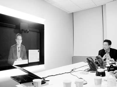 圖:Orange網絡解決方案業(yè)務部副總裁Nicolas Roy在巴黎演講,Orange中國區(qū)首席技術官劉昕(右)在主持北京視頻會議現場
