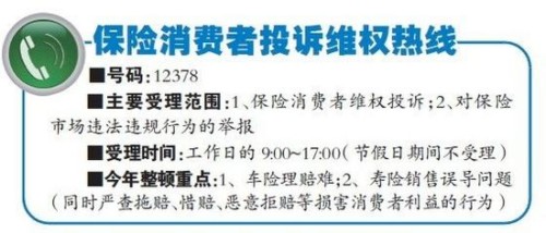據(jù)保監(jiān)部門介紹,12378保險消費者投訴維權(quán)熱線的受理范圍主要有兩個方面:一是保險消費者維權(quán)投訴;二是對保險市場違法違規(guī)行為的舉報。