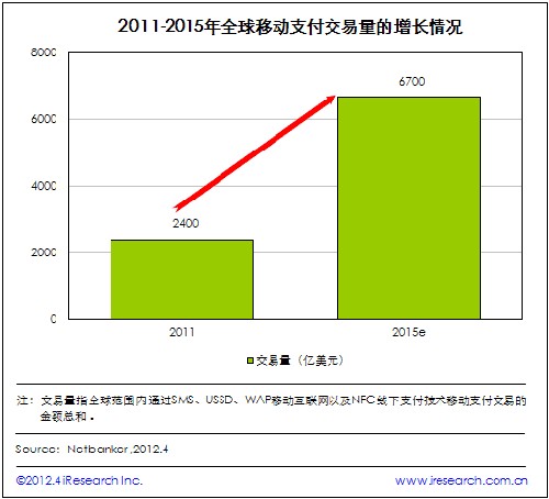 iResearch艾瑞咨詢整理Netbanker的最新數(shù)據(jù)發(fā)現(xiàn),2011年全球移動支付交易量達(dá)到2400億美元。該統(tǒng)計數(shù)據(jù)顯示,2015年全球移動支付交易量將達(dá)到6700億美元,使用手機(jī)銀行應(yīng)用程序的用戶數(shù)量較2010年將增加45%左右。另外,預(yù)計在未來18個月內(nèi)還會有20個國家增設(shè)NFC服務(wù)。