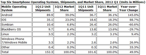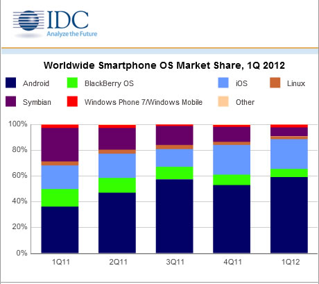 Android和蘋果的iOS繼續(xù)主導全球智能手機行業(yè),這兩個平臺的總出貨量占到2012年一季度所有智能手機出貨量的82%。其中Android手機以8900萬臺占據(jù)整個行業(yè)出貨量的59%,而蘋果以3510萬臺的出貨量占據(jù)23%的市場份額。這些數(shù)據(jù)均來自IDC的最新研究報告。