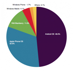 北京時(shí)間5月8日早間消息,市場調(diào)研公司尼爾森周一發(fā)布調(diào)查報(bào)告稱,美國市場智能機(jī)用戶量已經(jīng)超越基本功能手機(jī)用戶量。今年3月,智能機(jī)在美國手機(jī)市場的份額為50.4%,Android繼續(xù)占據(jù)統(tǒng)治地位,在智能機(jī)中的份額為48.5%。