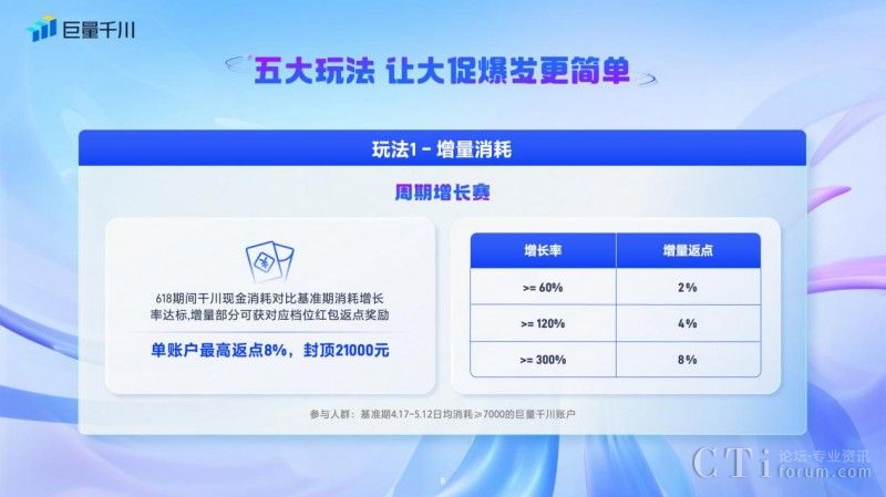一、「周期增長(zhǎng)賽」:針對(duì)在618好物節(jié)期間現(xiàn)金消耗對(duì)比基準(zhǔn)期消耗增長(zhǎng)率達(dá)標(biāo)的商家,增量部分可獲得對(duì)應(yīng)檔位紅包返點(diǎn)獎(jiǎng)勵(lì),單賬戶最高返點(diǎn)8%,封頂21000元。