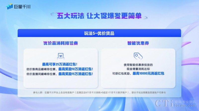 五、「優(yōu)價(jià)貨品玩法 」:優(yōu)價(jià)貨品商家也可以參與優(yōu)價(jià)品消耗排位賽和智能優(yōu)惠券活動(dòng)玩法。平臺(tái)推出優(yōu)價(jià)推商品和優(yōu)價(jià)直播間巔峰排位賽,商家累計(jì)最高可享25萬(wàn)消返紅包。對(duì)于使用智能優(yōu)惠券投放的商家,現(xiàn)金增量消耗達(dá)標(biāo)可獲得最高10000元的消返紅包獎(jiǎng)勵(lì)。
