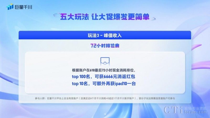 三、「72小時(shí)排位賽 」:針對(duì)巨量千川平臺(tái)上合法有效賬號(hào),且滿足近6個(gè)月千川消耗>0或近1個(gè)月千川新開賬戶,按照商家的峰值收入可以參與72小時(shí)排位賽,根據(jù)賬戶在618最后72小時(shí)現(xiàn)金消耗進(jìn)行排位,排位Top100的商家可得6666元消返紅包,Top10可額外再得ipad10一臺(tái)。