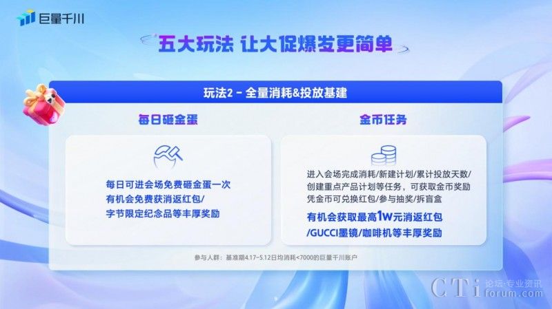 二、「每日砸金蛋&金幣任務(wù)」:針對(duì)在618好物節(jié)期間現(xiàn)金消耗對(duì)比基準(zhǔn)期消耗增長(zhǎng)率未達(dá)標(biāo)的商家,可參與每日砸金蛋和金幣任務(wù)。商家每日可進(jìn)入會(huì)場(chǎng)免費(fèi)砸金蛋一次,就有機(jī)會(huì)免費(fèi)獲得消返紅包和字節(jié)限定紀(jì)念品等獎(jiǎng)勵(lì)。此外,商家進(jìn)入會(huì)場(chǎng)完成消耗/新建計(jì)劃/累計(jì)投放天數(shù)/創(chuàng)建重點(diǎn)產(chǎn)品計(jì)劃等任務(wù),可獲取金幣獎(jiǎng)勵(lì),憑金幣可兌換紅包、參與抽獎(jiǎng)和拆盲盒等豐厚獎(jiǎng)勵(lì),最高可得10000元消返紅包。