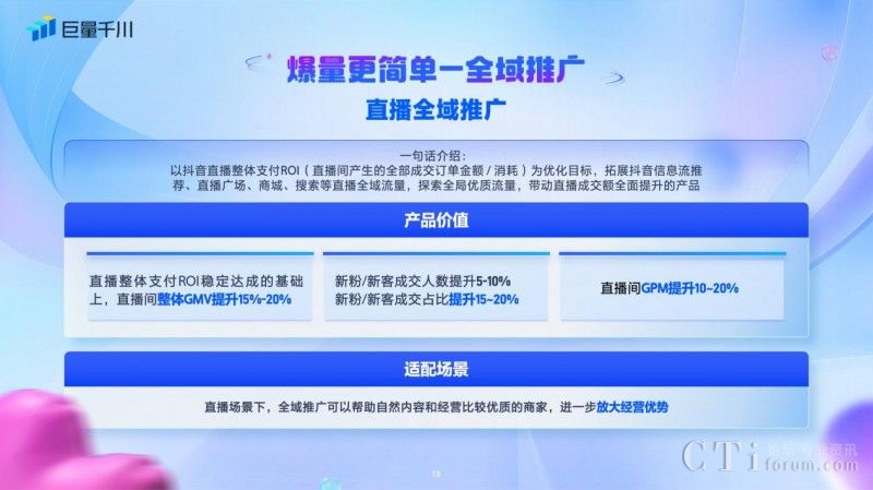 獲取生意增量是商家生意經(jīng)營(yíng)的重中之重,升級(jí)后的全域推廣分為直播全域推廣和商品全域推廣,讓爆量變得更簡(jiǎn)單。直播全域推廣打通廣告和自然流量,以抖音直播整體ROI為優(yōu)化目標(biāo),拓展抖音信息流推薦、直播廣場(chǎng)、商城、搜索等直播全域流量,帶動(dòng)直播成交額全面提升,放大直播生意,直播間整體GMV提升15%~20%,新客/新粉成交占比提升15%~20%。