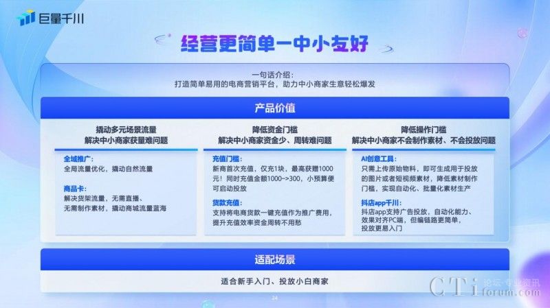 針對(duì)中小商家經(jīng)營(yíng)長(zhǎng)效問題,巨量千川打造簡(jiǎn)單易用的電商營(yíng)銷平臺(tái)。撬動(dòng)多元場(chǎng)景流量,解決中小商家獲量難題;降低資金門檻,解決資金少、周轉(zhuǎn)難的問題;降低素材制作操作門檻,解決商家“不會(huì)投”、“不敢投”的難題,讓經(jīng)營(yíng)更簡(jiǎn)單。