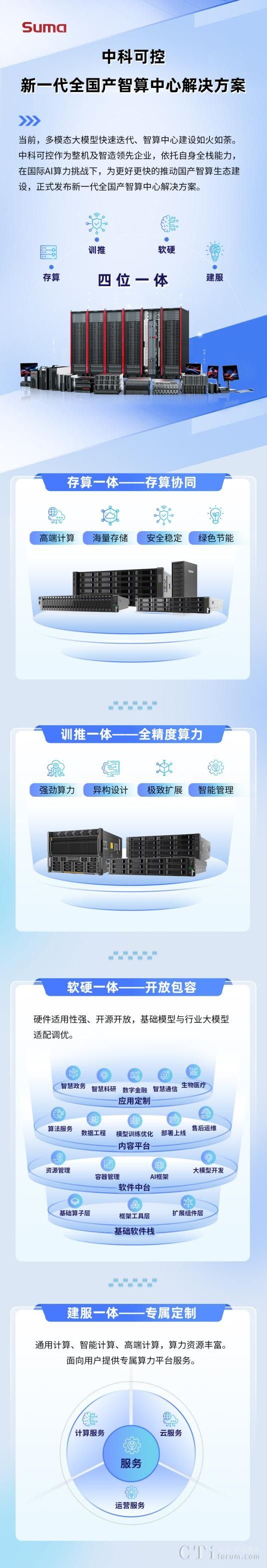 作為整機(jī)及智造領(lǐng)先企業(yè),中科可控一直堅(jiān)持國產(chǎn)自主路線,結(jié)合當(dāng)下行業(yè)對于AI技術(shù)的需求,在原有通用解決方案的基礎(chǔ)上,全面推出新一代全國產(chǎn)智算中心解決方案。該方案通過“存算+訓(xùn)推+軟硬+建服”四位一體的理念,推動國產(chǎn)智算生態(tài)建設(shè),賦能千行百業(yè)數(shù)智化轉(zhuǎn)型。