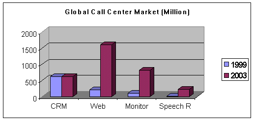 。。在1999年,全球呼叫中心應(yīng)用軟件的市場總值為29億美元,到2003年這一數(shù)字將增長近三倍,達(dá)到85億美元。這一增長主要來源于對基于互聯(lián)網(wǎng)呼叫應(yīng)用軟件以及呼叫監(jiān)控解決方案的需求。Data-monitor 市場分析專家在1999年針對呼叫中心軟件市場進行調(diào)研,具體數(shù)字詳見下表:
