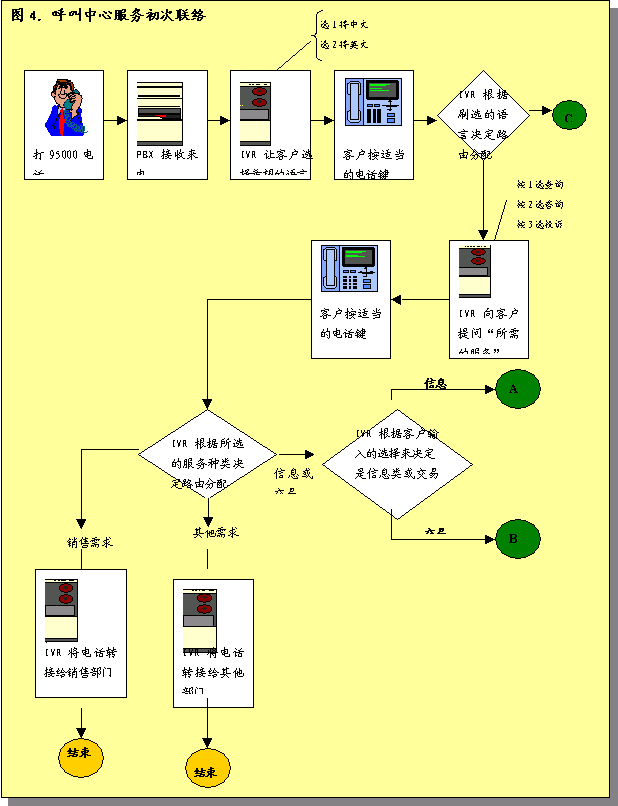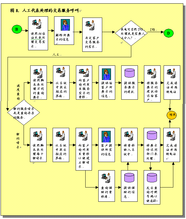 圖3概述了呼叫中心服務呼叫處理過程。描述了進入呼叫中心系統(tǒng)的各種呼叫如何完成處理過程,或者由真人代表完成,或者是通過IVR技術完成。