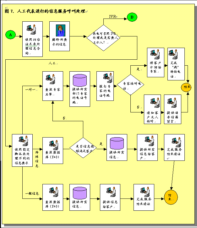 各部門也需要修改步驟處理和完成服務請求,F(xiàn)在,大多數(shù)公司個別部門接受和完成服務請求。許多部門在完成工作之后沒有對結果進行跟蹤回訪。對于一些部門服務請求只是紙上談兵。為了有效的提供呼叫中心服務并為服務請求提供信息,各部門必須采用新的步驟。這些步驟應包括從服務請求系統(tǒng)中重新獲取呼叫請求信息,跟蹤這些請求,工作完成后更新服務請求系統(tǒng)。對于沒有信息系統(tǒng)和目前使用人工操作的部門,要達到這一工作要求就需要設計和實施新的程序和系統(tǒng)。