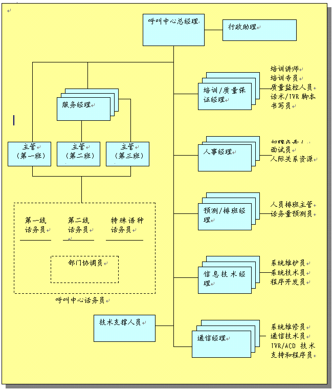 呼叫中心組織結構概述了中心的任務和職責。對組織進行了統(tǒng)籌安排以便中心能有效達到工作目標,組織安排主要有: