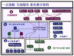 在“一對(duì)一模式”中,BroadVision公司可以為原有后臺(tái)系統(tǒng)提供有機(jī)的整合(如連接用戶的記費(fèi)、業(yè)務(wù)、用戶數(shù)據(jù)系統(tǒng)),使其在前臺(tái)可提供多種用戶的接入手段,形成業(yè)務(wù)的完整流程,如通過多種接入手段提供查詢、咨詢、受理、投訴等業(yè)務(wù);電信企業(yè)還可通過此平臺(tái)提供增值業(yè)務(wù),如電子商務(wù)、信息服務(wù)、代繳費(fèi)等。