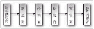 在社會化大生產(chǎn)的前提下,任何商品被制造和被消費(fèi)的過程,實(shí)際上是在多個環(huán)節(jié)、多個商家進(jìn)行“傳遞”的過程,這一過程構(gòu)成的“通道”就是“供應(yīng)鏈”。供應(yīng)鏈的研究就是從分銷模式開始的。在分銷模式下,最常見的價值傳遞的通道如下圖所示: