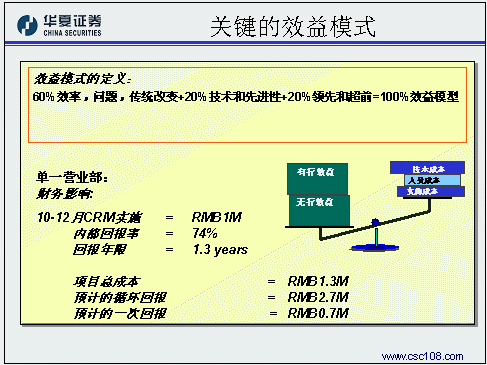 華夏證券經(jīng)紀業(yè)務總部的姚磊作為唯一的成功應用案例代表,主要是和與會的金融機構(gòu)分享在客戶關系管理規(guī)劃方面的一些成功經(jīng)驗。華夏證券認為,對于證券公司的經(jīng)紀業(yè)務來講,客戶關系管理的主要目標應該是把客戶關系管理系統(tǒng)的核心功能融入開戶、交易、服務、咨詢等四個與客戶互動的過程之中,比如:客戶資料規(guī)戶整合形成統(tǒng)一的客戶號,管理客戶交易偏好和產(chǎn)品偏好上的變化,配合多種渠道建立一對一銷售流程,客戶終身價值管理。在風險控制方面,華夏證券同樣貢獻了寶貴的經(jīng)驗,在這方面他們認為最重要的方面是要做好高層領導的灌輸和培訓工作,讓企業(yè)的高層領導對于客戶關系管理有一個正確的理解,從而對于項目的投資有一個合理的預期和實證,通俗一點說,就是首先為整個項目找一個合適的發(fā)起人。第二點要注意,要有專業(yè)的項目管理隊伍,這其實就是集成商選擇方面的風險。除此之外,還要對項目要有一個明確的定義,關注每一步提交的結(jié)果,在項目過程中就隨時發(fā)現(xiàn)問題、解決問題。