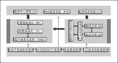 在信息技術(shù)管理子系統(tǒng)中,CRM的各功能模塊和相關(guān)系統(tǒng)運行都必須由先進的技術(shù)、設(shè)備、軟件來保障,主要的內(nèi)容可以分為以下四類:其他子系統(tǒng)應(yīng)用軟件管理,如數(shù)據(jù)庫管理系統(tǒng)、電子軟件分發(fā)系統(tǒng)等;中間軟件和系統(tǒng)工具的管理,如中間軟件系統(tǒng)、系統(tǒng)執(zhí)行管理工具等;企業(yè)級系統(tǒng)的集成管理,如CRM與企業(yè)管理信息系統(tǒng)的集成,乃至整個的企業(yè)應(yīng)用集成方案,以實現(xiàn)將企業(yè)的CRM與ERP、SCM等系統(tǒng)緊密集成;電子商務(wù)技術(shù)和標準的管理,如Internet技術(shù)、EDI技術(shù)及標準、通信標準的管理等。為支持無線應(yīng)用,CRM技術(shù)管理子系統(tǒng)將提供與手機、PDA、智能家電等工具的通訊接口,采用J2EE或.NET技術(shù)平臺,以及在支持無線傳輸和無線LAN應(yīng)用等方面進行相應(yīng)的調(diào)整。