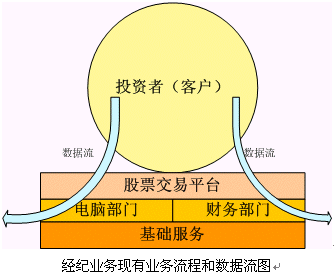 。。從上圖可以看出,現(xiàn)在的證券公司的經(jīng)紀(jì)業(yè)務(wù)為各個(gè)股民或者說投資者所提供的服務(wù)就是交易平臺(tái)的服務(wù),也就是交易通道服務(wù)。營(yíng)業(yè)部的其他服務(wù)都是為這個(gè)交易通道服務(wù),這些服務(wù)品種都是非;A(chǔ)的。而營(yíng)業(yè)部的數(shù)據(jù)流,也就是各個(gè)客戶的基本信息和交易信息,通過電腦部和財(cái)務(wù)部門就走到了終結(jié),沒有被更好的利用。