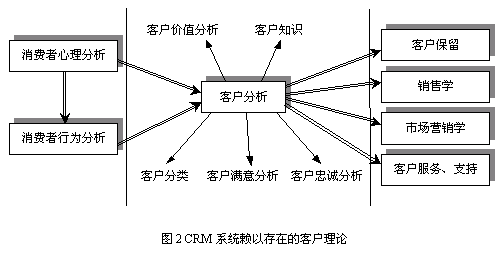 大多數(shù)CRM研究人員和應(yīng)用專家不認(rèn)為CRM存在作為應(yīng)用支撐的理論基礎(chǔ),充其量認(rèn)為CRM只是支持企業(yè)營銷的商業(yè)策略。隨著企業(yè)追求市場活動績效的熱情的提高,企業(yè)開始采用定性和定量的分析方法決策其與市場和客戶有關(guān)的企業(yè)活動,如有效的客戶滿意度評價、客戶分類、客戶盈利率分析等。而這些決策迫切需要相關(guān)的理論基礎(chǔ)為指導(dǎo),真正擺脫靠經(jīng)驗進(jìn)行決策的做法。當(dāng)前CRM的理論研究和學(xué)術(shù)探討并未真正走向體系化、統(tǒng)一化,所以造成CRM市場中提供的功能參差不齊。CRM系統(tǒng)必須存在一個完整的理論體系為指導(dǎo),本文將CRM系統(tǒng)賴以存在的理論基礎(chǔ)統(tǒng)稱為客戶理論(Theory on Customer)。