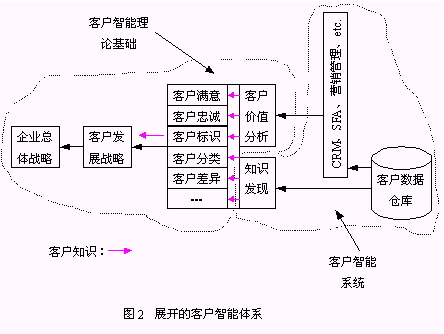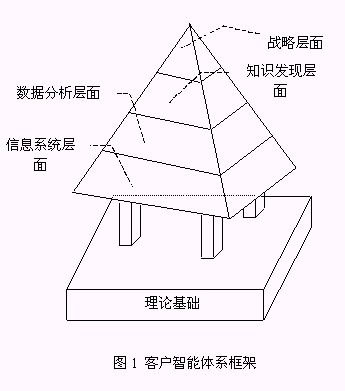 客戶智能系統(tǒng)(CI System)是本文提出的實(shí)現(xiàn)客戶智能的系統(tǒng)平臺(tái)。它包括了客戶智能體系中的信息系統(tǒng)層面、數(shù)據(jù)分析層面、知識(shí)發(fā)現(xiàn)層面,是基于客戶智能理論的可操作的系統(tǒng)框架。因此,客戶智能體系也可以簡(jiǎn)單地用客戶智能基礎(chǔ)理論和基于客戶智能理論的客戶智能系統(tǒng)兩個(gè)邏輯層面表示(圖2);诳蛻糁悄艿腃RM系統(tǒng)是本文描述的客戶智能系統(tǒng)中的一種。