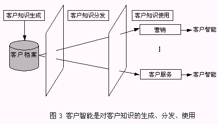 客戶知識(shí)是人們通過(guò)實(shí)踐認(rèn)識(shí)到的、與客戶有關(guān)的規(guī)律性,而客戶智能是獲得客戶知識(shí)并使用客戶知識(shí)求解問(wèn)題的能力?蛻糁悄苁菍(duì)企業(yè)戰(zhàn)略決策真正有價(jià)值的事物和行動(dòng)?蛻糁悄懿粌H包括了客戶知識(shí)的生成,而且更強(qiáng)調(diào)了客戶知識(shí)在企業(yè)中的分發(fā)、使用,直到產(chǎn)生客戶智能。所以,客戶智能是對(duì)客戶知識(shí)的生成、分發(fā)和使用(圖3)。