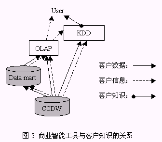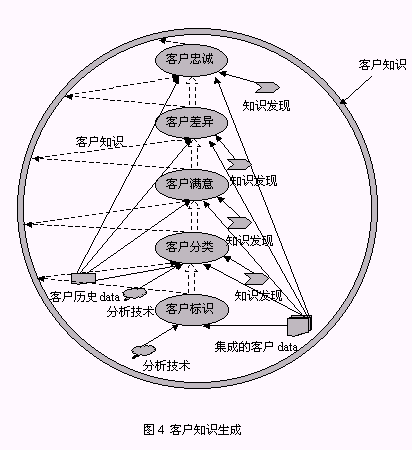 從以上構(gòu)成系統(tǒng)的三個(gè)組件的介紹中同時(shí)可以找到對(duì)以下兩個(gè)問(wèn)題的答案:1、客戶數(shù)據(jù)、客戶信息、客戶知識(shí)之間的區(qū)別(圖5):由來(lái)自于事務(wù)系統(tǒng),如ERP、SFA等的源數(shù)據(jù)經(jīng)整理后放入CCDW或數(shù)據(jù)集市,這一過(guò)程處理的對(duì)象稱為客戶數(shù)據(jù);OLAP為決策人員提供了展示有意義的客戶數(shù)據(jù)的機(jī)制,這種有意義的客戶數(shù)據(jù)稱之為客戶信息;客戶數(shù)據(jù)和客戶信息均可以通過(guò)KDD技術(shù)的運(yùn)用,提升為對(duì)決策有價(jià)值的客戶知識(shí)。2、客戶知識(shí)生成的途徑:從對(duì)第一個(gè)問(wèn)題的解答中可以知道,客戶知識(shí)從KDD作用的對(duì)象來(lái)看有兩種途徑:KDD作用于客戶數(shù)據(jù)、KDD作用于客戶信息,總之,客戶知識(shí)生成是依賴于KDD過(guò)程的復(fù)雜的過(guò)程。