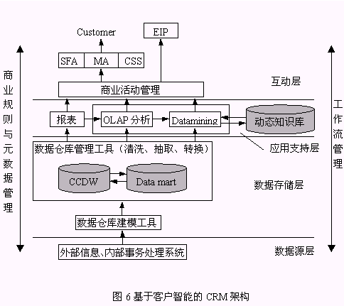 圖6是本文給出的以客戶智能為核心的I-CRM系統(tǒng)架構(gòu)。從數(shù)據(jù)源層來(lái)的客戶數(shù)據(jù)經(jīng)過(guò)ETL(抽取、轉(zhuǎn)換、裝載)、清洗后以數(shù)據(jù)存儲(chǔ)層的CCDW或數(shù)據(jù)集市的形式存儲(chǔ)。應(yīng)用支持層是提供了報(bào)表查詢、OLAP、知識(shí)發(fā)現(xiàn)分析決策工具,作用于客戶數(shù)據(jù),該過(guò)程產(chǎn)生的有價(jià)值的客戶知識(shí)存儲(chǔ)于動(dòng)態(tài)知識(shí)庫(kù)中。互動(dòng)層提供了I-CRM利用客戶知識(shí)從而有效實(shí)施其功能的場(chǎng)所。該架構(gòu)具有以下特點(diǎn):