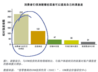 IBM商業(yè)價值研究中心的一項研究結(jié)果印證了筆者的設(shè)想。IBM 對美國10家零售商的消費群進(jìn)行了調(diào)查,其中包括5家表現(xiàn)較好的(過去3年中在店面單位面積銷售和凈收入的增長方面做得很好)和5家表現(xiàn)較差的(業(yè)績持平或出現(xiàn)下滑)。調(diào)查發(fā)現(xiàn),領(lǐng)先的零售商能夠同時有效使用關(guān)鍵的滿意度推動因素和關(guān)系要素,為消費者提供最佳的“總體體驗”,即一家公司(或一個品牌)有形、無形地給客戶留下的總體印象。該項調(diào)查的統(tǒng)計分析結(jié)果發(fā)現(xiàn)了5組滿意度推動因素: