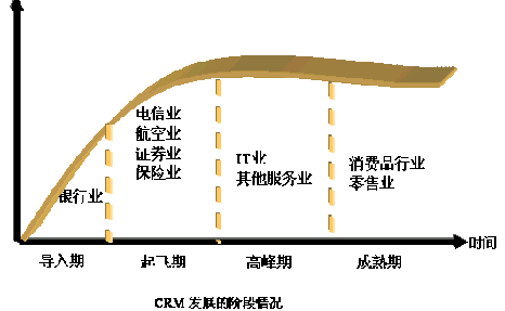 從圖中我們可以大致看出CRM的發(fā)展情況。保險,電信行業(yè)對這比較重視,而且得到了一定的應用。但是在其他行業(yè)中的發(fā)展仍然比較緩慢。面對中國的龐大市場,從CRM的發(fā)展中不難看出:會隨著經(jīng)濟的發(fā)展得到長足的發(fā)展。隨著經(jīng)歷早期客戶是蒙昧期,后來是觀察期,現(xiàn)在是選擇期,CRM市場可能出現(xiàn)爆炸性的增長。CRM本身是很好的,發(fā)展到一定階段,引導期已經(jīng)過了,又會發(fā)展起來。