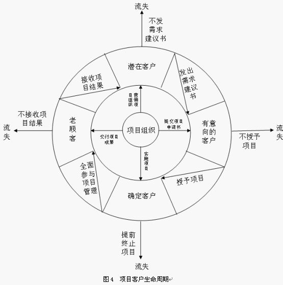 需要特別注意的一點(diǎn)是,在項(xiàng)目的整個(gè)生命周期中,如果客戶不滿意項(xiàng)目組織提供的服務(wù),將會(huì)離開項(xiàng)目組織,造成客戶流失。