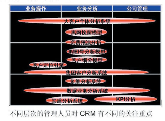 同理,面向大客戶和集團(tuán)客戶工作的大客戶個體分析系統(tǒng)和集團(tuán)客戶分析系統(tǒng)因為其面向一個部門的特殊性,所以橫跨了業(yè)務(wù)操作、業(yè)務(wù)分析和管理三個層次。只有將CRM系統(tǒng)的建設(shè)按照模塊化結(jié)構(gòu)化的思路進(jìn)行才能真正滿足用戶的實際需求和其日常工作與業(yè)務(wù)緊密聯(lián)系起來,使CRM系統(tǒng)發(fā)揮出應(yīng)有的效果。
