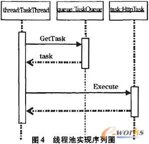 為解決頻繁創(chuàng)建線程導(dǎo)致的線程生命周期開銷和資源消耗問題,借鑒在網(wǎng)絡(luò)服務(wù)中常見的線程池技術(shù)。由于服務(wù)器需要處理大量的網(wǎng)絡(luò)請(qǐng)求,為避免大量的線程創(chuàng)建和銷毀所導(dǎo)致的問題,通常使用線程池來處理網(wǎng)絡(luò)請(qǐng)求,即在線程池中預(yù)先創(chuàng)建一定數(shù)量的線程,當(dāng)新的網(wǎng)絡(luò)任務(wù)到達(dá)時(shí),由線程池中一個(gè)空閑線程執(zhí)行該任務(wù),任務(wù)執(zhí)行完畢后該線程并不銷毀,而是重新返回線程池中并等待新的任務(wù)到達(dá)。對(duì)于J2ME設(shè)備需要頻繁連接網(wǎng)絡(luò)的情況下,線程池不失為一個(gè)提高性能、節(jié)約系統(tǒng)資源的好方法。圖4給出了線程池實(shí)現(xiàn)的序列圖。