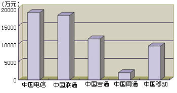 通過引入IP電話業(yè)務(wù),我國電信市場已經(jīng)形成了以中國電信、中國聯(lián)通、中國移動、中國吉通和中國網(wǎng)通等五大電信運營公司為主體的新格局。他們各自的業(yè)務(wù)范圍不盡相同,但IP電話是他們相同的業(yè)務(wù)之一,所以這一市場相互之間的競爭較為激烈。圖1和圖2分別表示這五大運營商在2000年上半年IP電話的話務(wù)量和收入。從圖中可以看出,他們在我國IP電話市場上所占據(jù)的地位和角色。