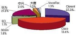 從圖3可以看出, Cisco、Clarent 和華為已經(jīng)成為我國(guó)IP電話設(shè)備市場(chǎng)的主要供應(yīng)商。