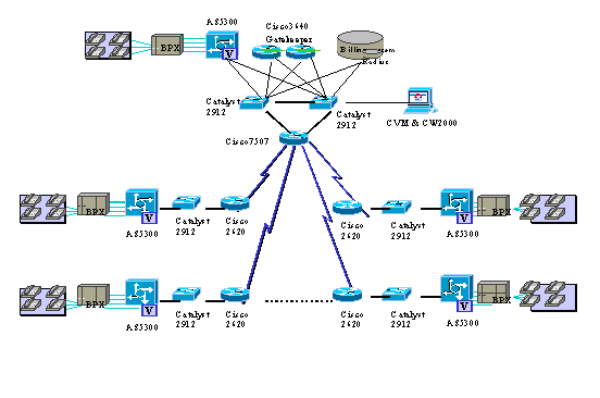 各地:采用CISCO2620路由器和AS5300語(yǔ)音網(wǎng)關(guān)。Cisco2620配2個(gè)串口和1個(gè)100M以太網(wǎng)口,串口用來(lái)連接DDN網(wǎng)絡(luò),100M口連到石油專用通信網(wǎng)局內(nèi)部數(shù)據(jù)網(wǎng)絡(luò),并與CISCO AS5300相連。AS5300有1個(gè)100M以太網(wǎng)口,1個(gè)10以太網(wǎng)口,4個(gè)E1口,60個(gè)VOIPDSP。4個(gè)E1口連接交換機(jī)。